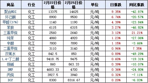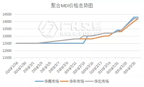 2月企业供应较少,业者低价惜售;个别企业计划量以外的货严格控制;2月主力企业挂牌上调,成本支撑走强。聚合MDI一改18年下半年颓势,奋力猛涨。
