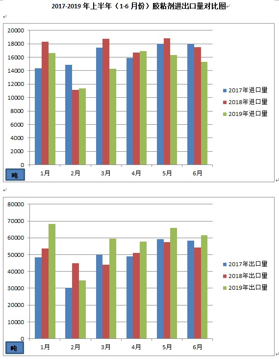 据国家海关总署数据统计:2019年第二季度(4-6月份),胶粘剂进口量为4.86万吨,进口额为5.90亿美元,较2018年同期分别增长-8.3%(5.30万吨)和1.9%(5.79亿美元);出口量为18.5万吨,出口额为5.46亿美元,较2018年同期分别增长13.8%(16.26万吨)和4.4%(5.23亿美元)。