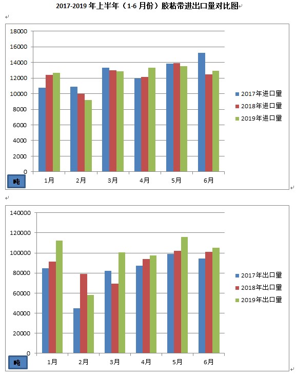 2019年上半年,胶粘带进口量共计7.45万吨,进口额为14.14亿美元,较2018年同期分别增长0.8%(7.39万吨)和-3.7%(14.68亿美元);出口量共计59.02万吨,出口额为20.91亿美元,较2018年同期分别增长9.95%(53.68万吨)和5.82%(19.76亿美元)。