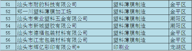 此次发布的汕头市VOCs重点监管企业名单中,包括178家企业,其中塑料薄膜、软包装、印刷、油墨等企业57家,它们分别是:
