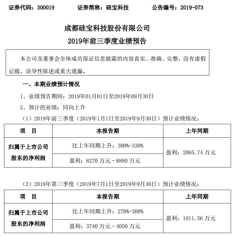 近日,硅宝科技发布2019年前三季度业绩预告,预计2019年前三季度(2019年1月1日至2019年9月30日)实现归属于上市公司股东的净利润超8000万元,比上年同期增长300%-330%