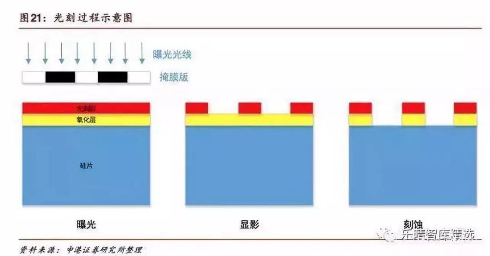 光刻是将图形由掩膜版上转移到硅片上,为后续的刻蚀步骤作准备。在光刻过程中,需在硅片上涂一层光刻胶,经紫外线曝光后,光刻胶的化学性质发生变化,在通过显影后,被曝光的光刻胶将被去除,从而实现将电路图形由掩膜版转移到光刻胶上。再经过刻蚀过程,实现电路图形由光刻胶转移到硅片上。在刻蚀过程中,光刻胶起防腐蚀的保护作用。
