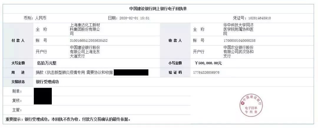 2月1日,上海康达化工新材料集团股份有限公司(股票代码:002669)决定向华中科技大学同济医学院附属协和医院、武汉大学中南医院两家抗击新型冠状病毒疫情的一线医院定向捐赠人民币100万元(协和医院50万元,中南医院50万元),专门用于湖北省武汉市一线医院医务工作者抗击新型冠状病毒感染的肺炎疫情防控工作。