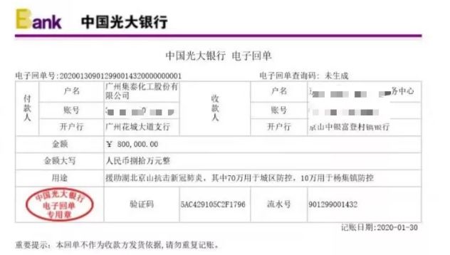 截至1月28日,广州集泰化工股份有限公司通过各种途径紧急采购价值20余万元的 9万只医用口罩,发往京山市红十字会,紧急驰援湖北抗击疫情。并于1月30日捐赠现金80万元。