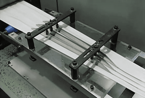 用机器让大片无纺布沿着斜面,由左到右逐渐变窄,做出“折叠结构”。