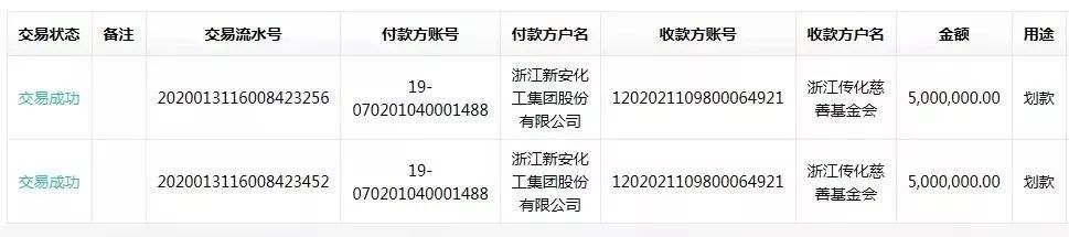 新安捐款1000万元及捐赠10吨84消毒液。 在全国防控疫情的关键时刻,浙江新安化工集团股份有限公司捐赠1000万元现金,通过传化慈善基金会,支持湖北、浙江等地防疫、抗疫工作,其中定向捐赠建德市慈善总会、开化县红十字会各150万元(现金各100万元、防疫物资价值各50万元),用于两地防疫抗疫工作。