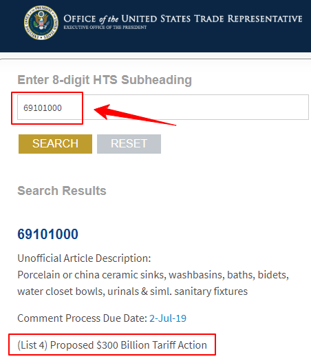 在最后一行“Search Tariff Lists”这里,则可以查询具体产品是否加税、何时开始加税。以陶瓷卫浴制品(HTS CODE:69101000)为例,在搜索框输入8位的HTS CODE,可以发现,它属于第四轮加税产品。