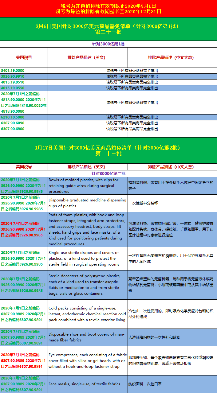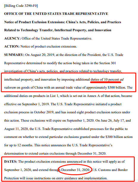 8月28日,美贸易代表办公室(USTR)公布了针对3000亿美元( 自2019年9月1日开征)中国产品加征关税(List 4A)中的共8批排除清单加征有效期(2020年9月1日到期)延长公告; 本次获得延长清单共涉及67个税号87项产品:其中14个税号下所有商品和53个税号下部分商品延长至2020年12月31日;未获得有效期延长的共涉及81个税号下128项产品;这128项产品9月1日起恢复加征7.5%关税。