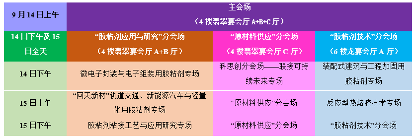 9月14日上午为主会场,下午开始分为“胶粘剂应用与研究、原材料供应、胶粘剂技术、压敏胶及制品”四个分会场同时进行。参会代表可以根据个人需要,通过串场,选择性地聆听感兴趣的报告内容,并与报告人进行有针对性的交流。