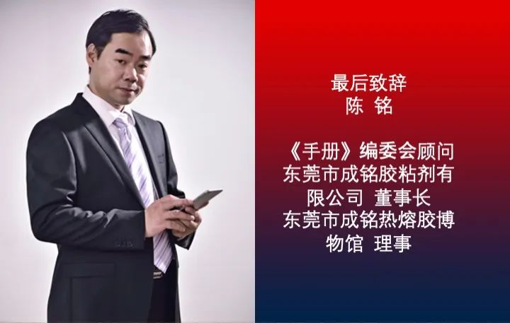 本次会议的主办单位东莞市成铭热熔胶博物馆的理事、东莞市成铭热熔胶博物馆举办单位东莞市成铭胶粘剂有限公司董事长陈铭最后致辞。他说:“《胶粘剂新技术与应用手册(第2版)》终于出版了,你们辛苦了!在此我代表东莞市成铭胶粘剂全体同仁以你们的付出表示衷心的感谢!向《胶粘剂新技术与应用手册(第2版)》顺利出版表示衷心的祝贺!东莞市成铭胶粘剂有限公司是胶粘剂行业一家中小企业,我们与胶粘剂有一种不同一般的深厚感情。为行业建立一个热熔胶交流的平台,我们建立了行业首家热熔胶博物馆-东莞市成铭热熔胶博物馆。博物馆自2015年开馆以来,共接待了上万名行业同仁和热熔胶爱好者;举办了三十多场饶有趣味的热熔胶科普活动;推动出版了《热熔压敏技术与应用》,编译出版了《胶黏剂新技术与应用手册(第2版)》等胶粘剂理论文献;为胶粘剂行业的健康持续发展发挥了一定的作用。我们将持续投入一定的人力和资金,继续加大行业理论研究,不断构建胶粘剂行业新的理念体系的发展,继续为胶粘剂知识的普及和提升贡献自己一份微薄的力量,也欢迎和感谢行业同仁的共同参与。“