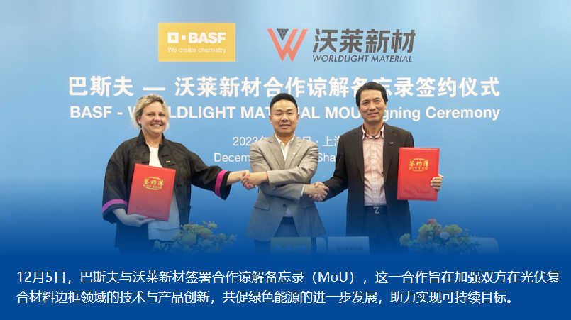 12月5日,巴斯夫与沃莱新材签署合作谅解备忘录(MoU),这一合作旨在加强双方在光伏复合材料边框领域的技术与产品创新,共促绿色能源的进一步发展,助力实现可持续目标。