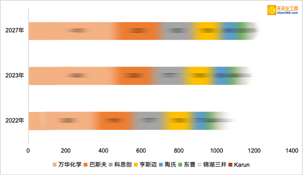 例图:2022 - 2027年全球各MDI生产商精馏产能展望(单位:万吨/年)