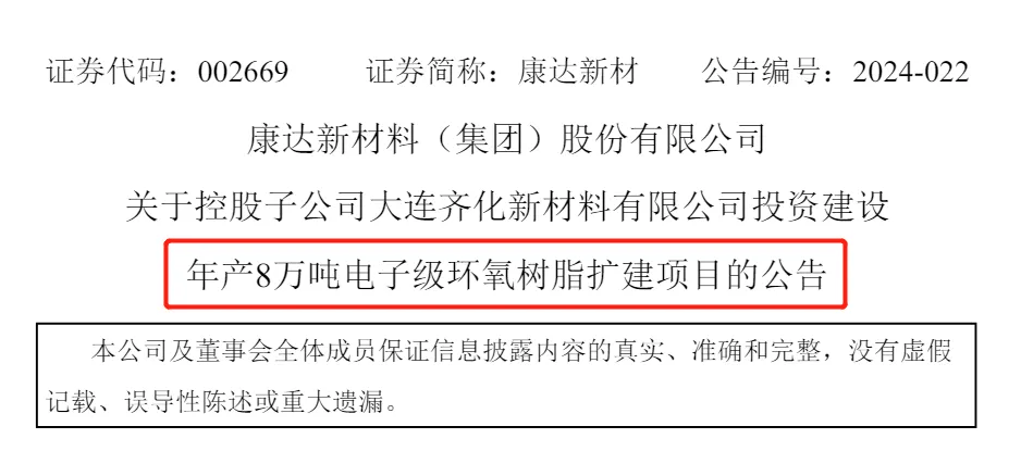 近日,康达新材发布公告,为深化落实康达新材料(集团)股份有限公司新材料产业链战略布局,进一步提升公司控股子公司大连齐化新材料有限公司环氧树脂产品产能,实现规模化效应,进行产品差异化竞争,大连齐化拟投资建设“年产8万吨电子级环氧树脂扩建项目”,总投资预计4亿元(最终投资金额以项目建设实际投入为准)。