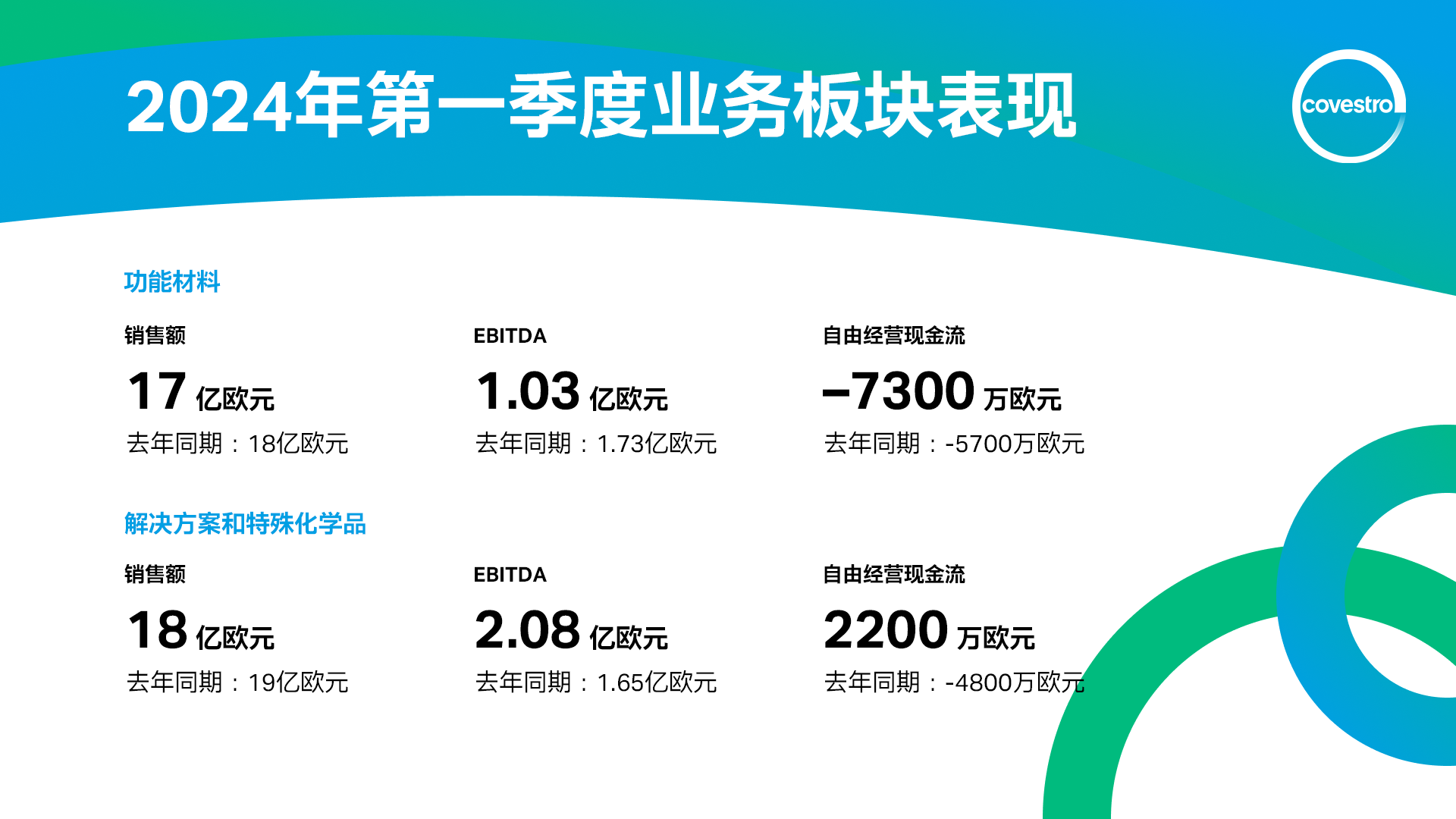2024年第一季度,功能材料板块销售额同比下降5.7%至17亿欧元(去年同期:18 亿欧元)。这与集团整体趋势一致,主要原因是将原材料价格的下降传导给客户导致平均销售价格下滑。然而,销量上升——尤其在亚太和 EMLA地区——对该板块销售额做出了积极贡献。该业务板块EBITDA下降40.5%至1.03亿欧元(去年同期:1.73 亿欧元),自由经营现金流为–7300万欧元(去年同期:–5700万欧元)。