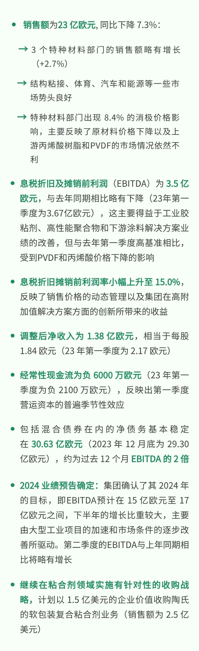 在经济环境大致不变的情况下,阿科玛2024年第一季度的息税折旧摊销前利润(EBITDA)表现强劲,符合2024全年业绩预告。