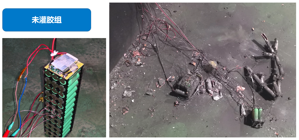 △未灌胶组:焊接汇流排结构散开四处飞散,碎片在3-5米范围内;电芯全部失效