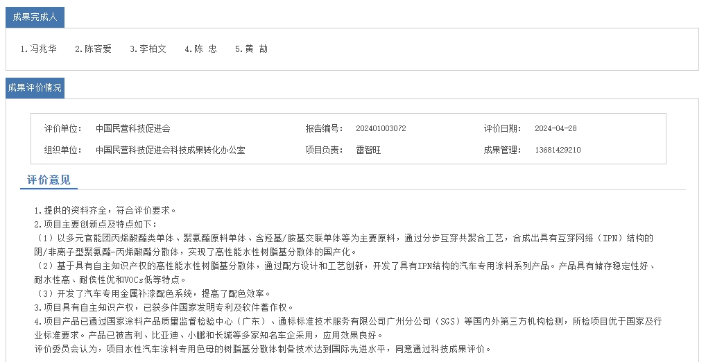 雅图高新材料股份有限公司“高性能可控结构水性汽车涂料专用色母”日前获得了国家科技成果鉴定。