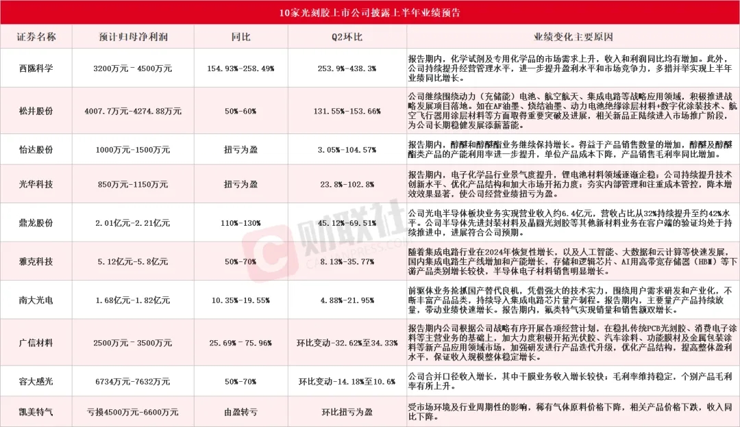 据Choice数据统计,截至发稿,包括西陇科学、松井股份、怡达股份、光华科技、鼎龙股份、雅克科技、南大光电、广信材料、容大感光和凯美特气在内的10家光刻胶上市公司披露上半年业绩预告。其中,西陇科学上半年净利同比预增154.93%-258.49%,鼎龙股份上半年净利同比预增110%-130%,广信材料和容大感光上半年净利同比最高预增达70%。环比表现方面,西陇科学Q2净利环比预增253.9%-438.3%,松井股份Q2净利环比预增131.55%-153.66%,凯美特气Q2净利环比预计扭亏为盈。