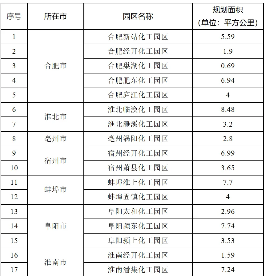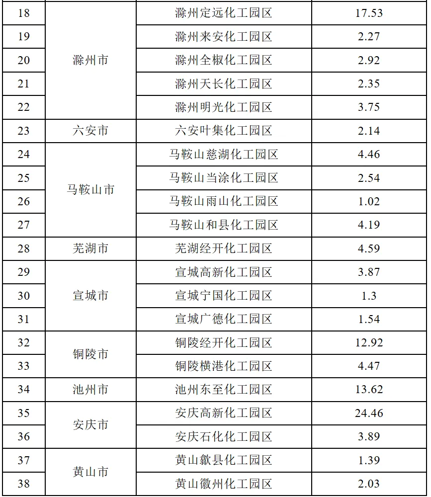 2021年5月,安徽省第一批化工园区名单(38家)公布: