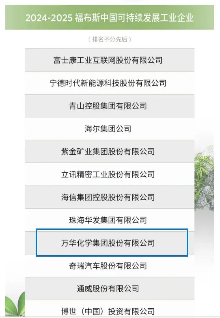 在近日发布的“福布斯中国可持续发展工业企业”榜单中,万华化学以其卓越的环境绩效和创新的绿色发展战略,荣获这一殊荣。作为主评选入选的40家企业之一,这不仅是对万华化学长期以来致力于可持续发展实践的认可,也是对其在全球化工行业中持续推动绿色转型的肯定。