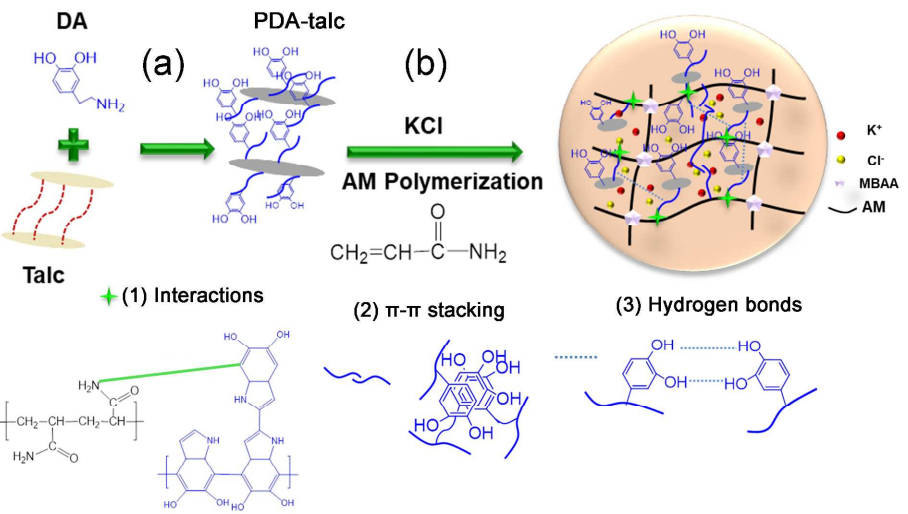 PDA链段中邻苯二酚,可以帮助PDA锚定在纳米滑石粉表面形成PDA-talc结构;同时,PDA可以与聚合丙烯酰胺之间形成化学交联网络;物理缠绕与化学交联的双重作用,极大地提高了水凝胶的力学性能。