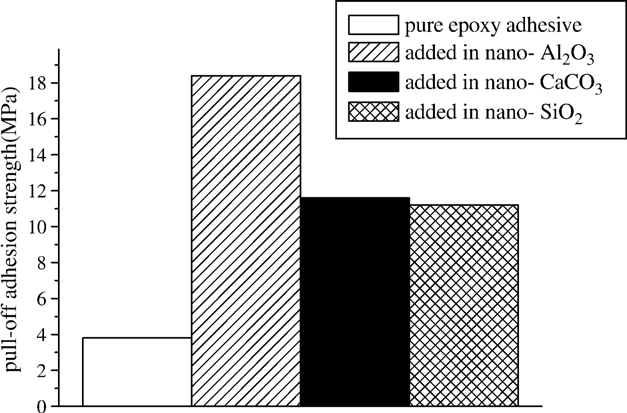 2)纳米粒子会影响环氧胶和钢材表面的化学性质,提供钢表面与胶黏剂之间的化学键。(the different improvement may be attributed to the chemical properties of nanoparticles, which may have influence on the chemical properties of the surfaces of steel and epoxy adhesive, produce some chemical bonds on each interface of steel and adhesive, and improve the adhesion strength.)