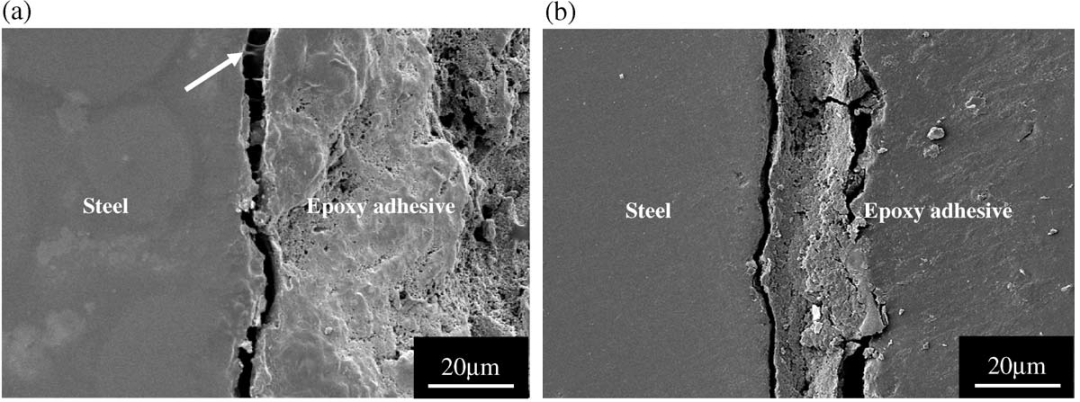 a图中,箭头所指的位置正是研究者认为纳米粒子促进环氧树脂与钢材紧密连接的证据。
