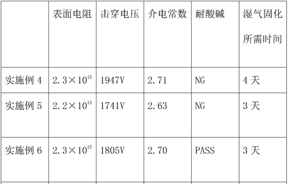 从上表可见,实施例4和实施例5都不能通过耐酸碱性测试,唯有实施例6才可以通过。其它性能上,三个实施例基本一致。