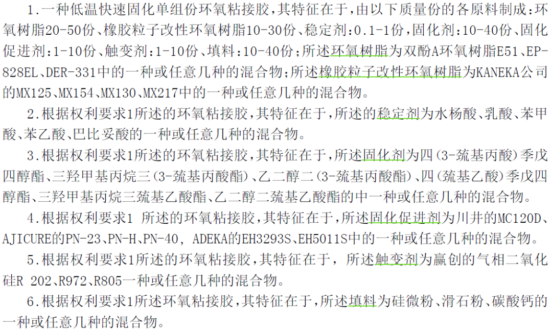 这个低温固化环氧胶的核心在于环氧树脂与固化剂/固化促进剂的搭配,或许因为这篇专利技术并无创新点,到目前为止还没被授权。