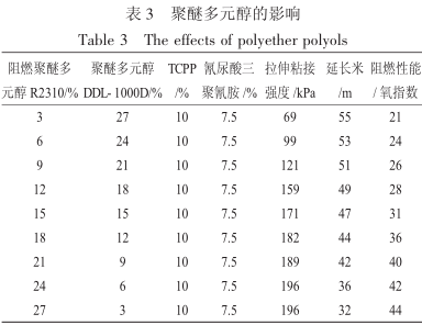 综上所述,在混合聚醚占配方30%,阻燃聚醚多元醇R2310 占配方15%~18%,聚醚多元醇DDL-1000D 占配方9%~15%,TCPP 添加量5%~10%,氰尿酸三聚氰胺添加量5%~10%的范围内:具备较好的阻燃性能(B1 级,氧指数≥30%);具备不发脆,较好的拉伸粘接强度(>170kPa),较好的延长米(>40m),较好的弹性(回弹高度>70mm),具备较好的喷出率(≥97.4%),从而得到阻燃性能、物理机械性能优异的产品。