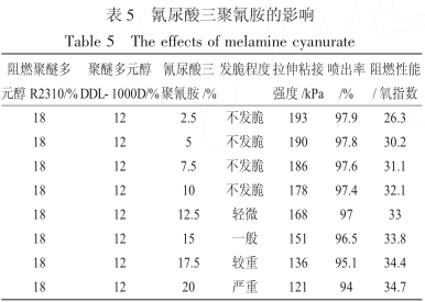 从表5 可以看出,在混合聚醚在配方中占比30%,阻燃聚醚多元醇R2310 与聚醚多元醇DDL-1000D在配方中占比分别为18%、12%的条件下,随着氰尿酸三聚氰胺在配方中占比变大,发脆程度逐步变大,拉伸粘接强度逐渐变小,喷出率逐渐变低,氧指数逐渐变高;在氰尿酸三聚氰胺添加量5%~10%的条件下,产品不发脆,拉伸粘接强度>170kPa,喷出率≥97.4%,阻燃性能:氧指数OI>30%。