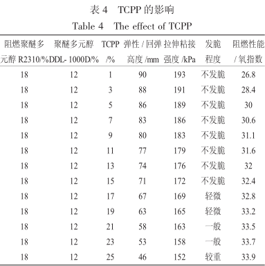 从表4 可以看出,在混合聚醚在配方中占比30%,阻燃聚醚多元醇R2310 与聚醚多元醇DDL-1000D在配方中占比分别为18%、12%的条件下,随着TCPP 添加量变大,弹性变差,脆性变大,拉伸粘接强度变低,氧指数变高、阻燃性能变好;由表4 可知在TCPP 添加量5%~15%的条件下,阻燃性能:氧指数OI>30%,产品不发脆,拉伸粘接强度>170kPa,具备较好的弹性:回弹高度>70mm。