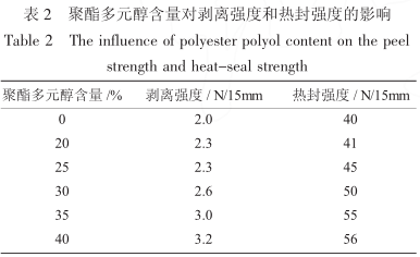 表 2 列出了不同聚酯含量胶粘剂复合 PET/PE40结构时所得的剥离强度和热封强度值。由于聚酯多元醇具有相对较强的极性和内聚力,所以聚酯多元醇含量增加时,胶粘剂的剥离强度和热封强度也相应增加,且明显高于纯聚醚胶粘剂体系。
