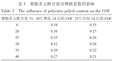 复合膜的摩擦系数受复合膜熟化温度影响差异比较大,同时熟化后的膜放在常温冷却的过程中,爽滑剂会有一定程度的回迁,导致摩擦系数会有一定程度的回复。一般来说经过常温一天的冷却后,复合膜的摩擦系数基本上稳定,不会再有变化。所以实验的过程中,会对刚刚完成熟化的膜的 COF做一次测试,然后将熟化好的膜放在常温冷却 24h后,再重新取样测一次 COF,一般以冷却后的数据作为判断胶粘剂对复合膜的影响。一般来说,冷却后的复合膜的摩擦系数应低于 0.28,否则会影响使用。表 3 列出了不同含量聚酯多元醇的胶粘剂复合所得膜的 COF 值。从表可以看出,随着聚酯多元醇含量的增加,复合膜的摩擦系数(刚刚熟化完成的和冷却后的)降低,同时发现,有聚酯多元醇的体系,复合膜冷却前后 COF 差异比较大,冷却后 COF明显低于冷却前,但是纯聚醚体系的复合膜,冷却后的 COF 依然高于行业使用标准值。
