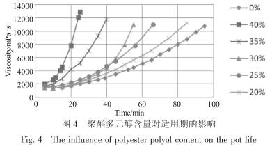 聚酯多元醇的黏度相较于聚醚多元醇而言要高,所得的聚氨酯预聚物黏度也比较高。但是双组分无溶剂胶粘剂的使用需要控制在一定的黏度范围内,一般来说,聚氨酯预聚物的黏度在常温下应该低于 10Pa·s,否则无法操作。所以需要控制聚酯多元醇在聚氨酯胶黏剂中的含量。图 3 列出了不同含量聚酯多元醇所制备的胶粘剂在 40℃时黏度增长随时间的变化曲线(也即胶粘剂的适用期)。由图4 可以看出,随聚酯多元醇含量从 20%增加到40%,胶粘剂的黏度增长很快,胶粘剂的适用期迅速缩短。当聚酯多元醇含量为 20%时,胶粘剂的适用期接近纯聚醚胶粘剂(聚酯多元醇含量为 0%)的适用期,可以满足行业使用要求。