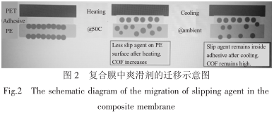 PE 膜在加工的过程中通常会加入一定量的爽滑剂以降低 PE 膜的摩擦系数。膜中的爽滑剂主要是芥酸酰胺,芥酸酰胺具有结晶性,会迁移到 PE 膜表面,形成一层非常薄的结晶性薄层,从而起到爽滑的作用。当 PE 膜与 PET或其他薄膜材料用胶粘剂进行复合后,在熟化过程中爽滑剂会向胶粘剂方向迁移,导致热封层表面爽滑剂的量明显减少,从而造成摩擦系数的升高,如图 2 所示。熟化温度越高,迁移越快,摩擦系数越高。熟化完成后,复合膜冷却到室温时,会有少部分爽滑剂回迁到热封层表面,但是大部分的爽滑剂仍然留在胶粘剂层和 PE膜本体内,造成最终复合膜的摩擦系数升高。所以复合所用的胶粘剂对摩擦系数有较大的影响。