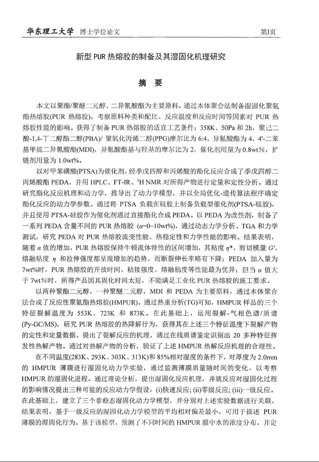 《新型PUR热熔胶的制备及其湿固化机理研究》,是华东理工大学孙莉2018年4月4日定稿的博士学位论文,是其在导师指导下,独立进行研究取得的工作结果。现将其博士论文的摘要、关键词、目录以图片形式摘录如下,以供对PUR感兴趣的研究人员参考!