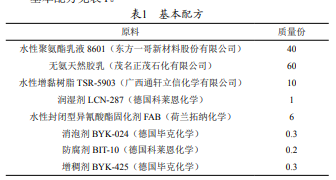 制作工艺 :参考表1 配方,先将水性聚氨酯乳液8601、低氨天然胶乳加入搅拌釜中,开启搅拌混合15min(500r/min), 然后加入增黏树脂 TSR-5903,水性封闭型异氰酸酯固化剂 FAB, 润湿剂 LCN287, 消泡剂 BYK024, 搅拌 30min, 然后加入增稠剂 BYK425,搅拌 2h(800r/min),调整黏度至 1 500~2 000cP,再加入防腐剂 BIT10,继续搅拌30min 后过滤出料。