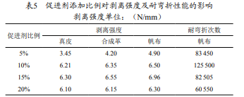 在同一胶黏剂组分中添加不同比例的促进剂,测试促进剂比例对黏接性能及耐弯折性的影响,如表5。结果表明,添加10% 比例性能最好,添加太少可能导致交联不足,剥离强度达不到最优,而添加过量又可能导致胶层过硬,影响耐弯 折性能。