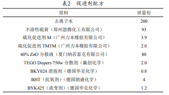 制作工艺 :参考表2配方,将分散剂、消泡剂加入去离子水中,搅拌20min(1 000r/min),使分散剂分散均匀,然后依次加入不溶性硫黄、硫化促进剂 M、TMTM,抗氧剂 BHT, 和 ZnO 分散液,高速搅拌30min 得到混合液,然后把混合液转到研磨机高速研磨2h 以上,直至细度达到5μm 以下,然后加入流变剂调整黏度至1 500~2 000cP,制得促进剂分散液。