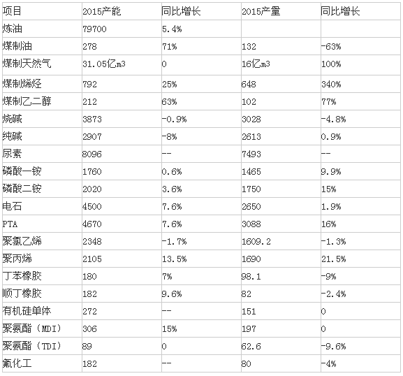 表1. 2015年重点产品产能、产量及增长情况(单位:产能、产量:万吨)