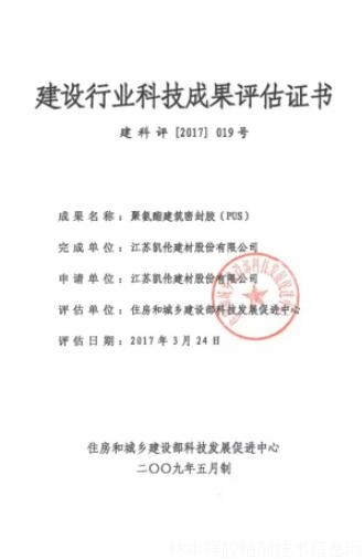 2017年3月24日,住房和城乡建设部科技发展促进中心在北京主持召开了由江苏凯伦建材股份有限公司研发的“聚氨酯建筑密封胶PUS”科技成果评估会。