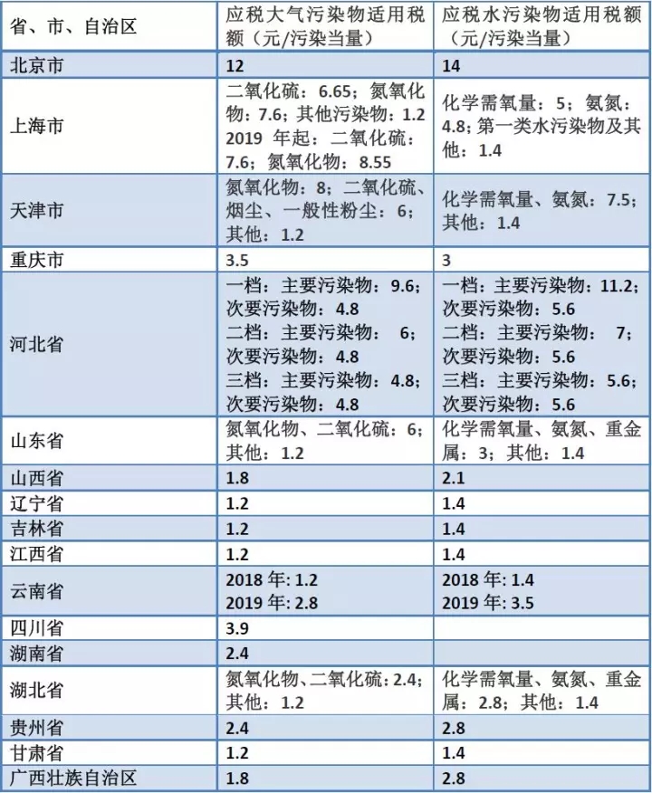 部分地区大气污染物、水污染物纳税标准