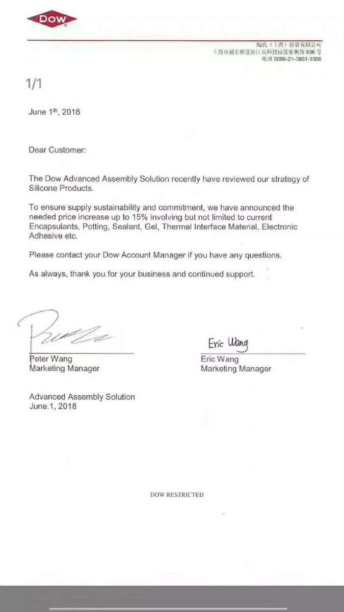 笔者了解到,全球有机硅的领导者——陶氏宣布6月1日起上调所有功能性有机硅产品价格。此次调价幅度会基于产品类型及业务领域,最高可达15%。