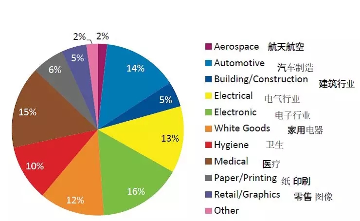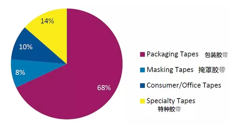 根据全球知名胶粘带咨询公司AWA总裁Corey MichaelReardon分析:近几年,全球胶粘带产业保持稳定增长态势,产业集中度不断提高,产业环保规则进一步规范。图1为全球胶粘带消费市场占比及分布。由图1可知,全球胶粘带主要消费品种为BOPP包装胶带,占总消费量的68%;最大的消费市场为亚太地区,占全球市场份额的54%,其中主要为中国大陆、日本和台湾地区。