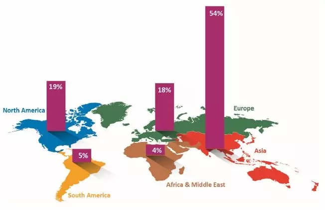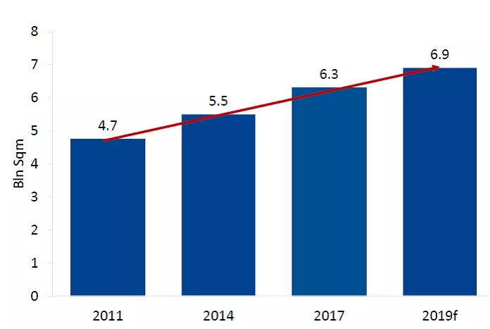 他认为,随着全球通用型胶粘带(如BOPP胶粘带、PVC电气胶粘带、建材用保护膜产品等)市场的逐渐饱和,通用型胶粘带行业已接近完全竞争市场,产品同质化现象凸显,行业也进入了微利时代。而高附加值的特种胶粘带产品已成为推动行业发展的引擎,2017年全球特种胶粘带消费规模已达到63亿平方米,过去三年平均增长速率达到4.6%,未来几年内还将保持高速增长态势。全球特种胶粘带市场分布及规模如图2所示。