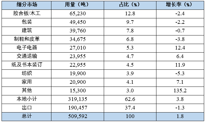从表2可以看出,醛基胶粘剂中增长较高的为酚醛胶粘剂,相比上一年增长了10.8%,而其他两个品种都略有下降。溶剂型胶粘剂整体是下降的,但其中其他树脂类相比上一年有8.0%的增长率。反应型胶粘剂中表现较为突出的是氰基丙烯酸酯胶粘剂,增长率达到了32.3%,但整体销售量仍然不高,在反应型胶粘剂中整体份额占的也较少。热熔型胶粘剂中EVA类增长较为迅猛,达到了23.2%。水基型胶粘剂中各个品种的增长都较为均衡,保持在1~3%的增长率。压敏胶中增长较快的品种为丙烯酸酯类,达到12.2%,但橡胶类压敏胶则是有所下降的。