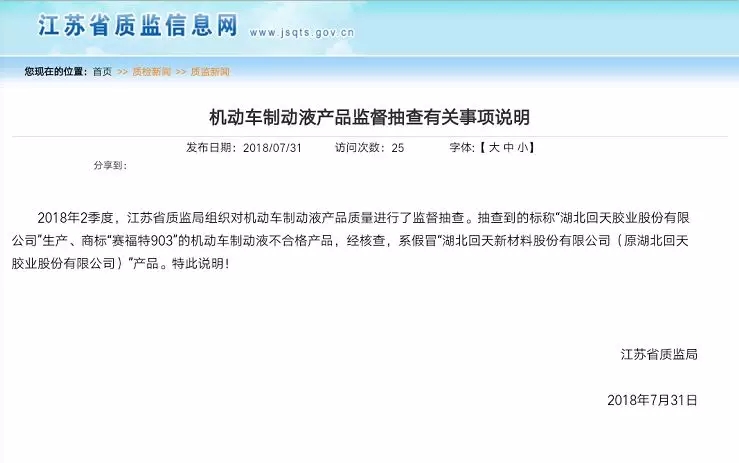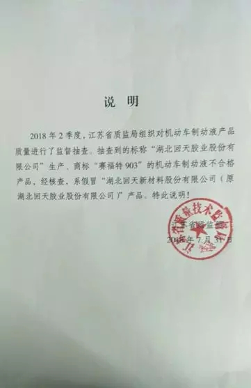 2018年7月24日,江苏省质监局发布了《机动车制动液产品质量监督抽查分析报告》,“湖北回天胶业股份有限公司”的回天“赛福特”903制动液被列入了《机动车制动液产品质量监督抽查不合格企业名单》名单。不合格企业名单公布后,各大证券网站、竞争对手纷纷转载;不明真相的客户问询电话不断打来,给企业发展造成了重大压力。