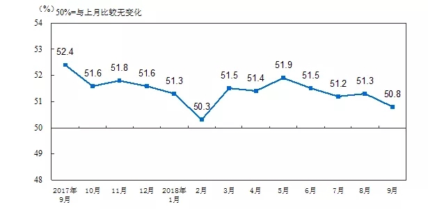 从数据中,我们可以明显看到17年9月以来,我国制造业的PMI指数一直是呈波动下降态势的。而在九月,制造业的PMI指数仅为50.8。要知道如果PMI指数接近于收缩指数(低于50)是十分危险的!