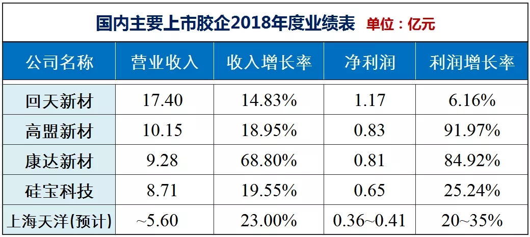 近日,康达新材、回天新材、高盟新材、硅宝科技等胶粘剂行业上市企业纷纷发布了2018年的年度业绩报告(上海天洋暂未公布),详情如下: